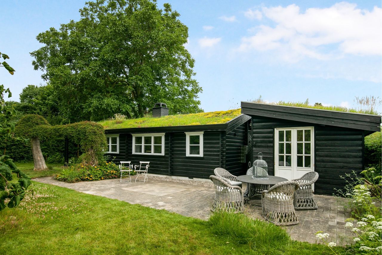Udvendigt befinder der sig et udhus på 23 kvadratmeter med badeværelse, køkken og et opholdsrum