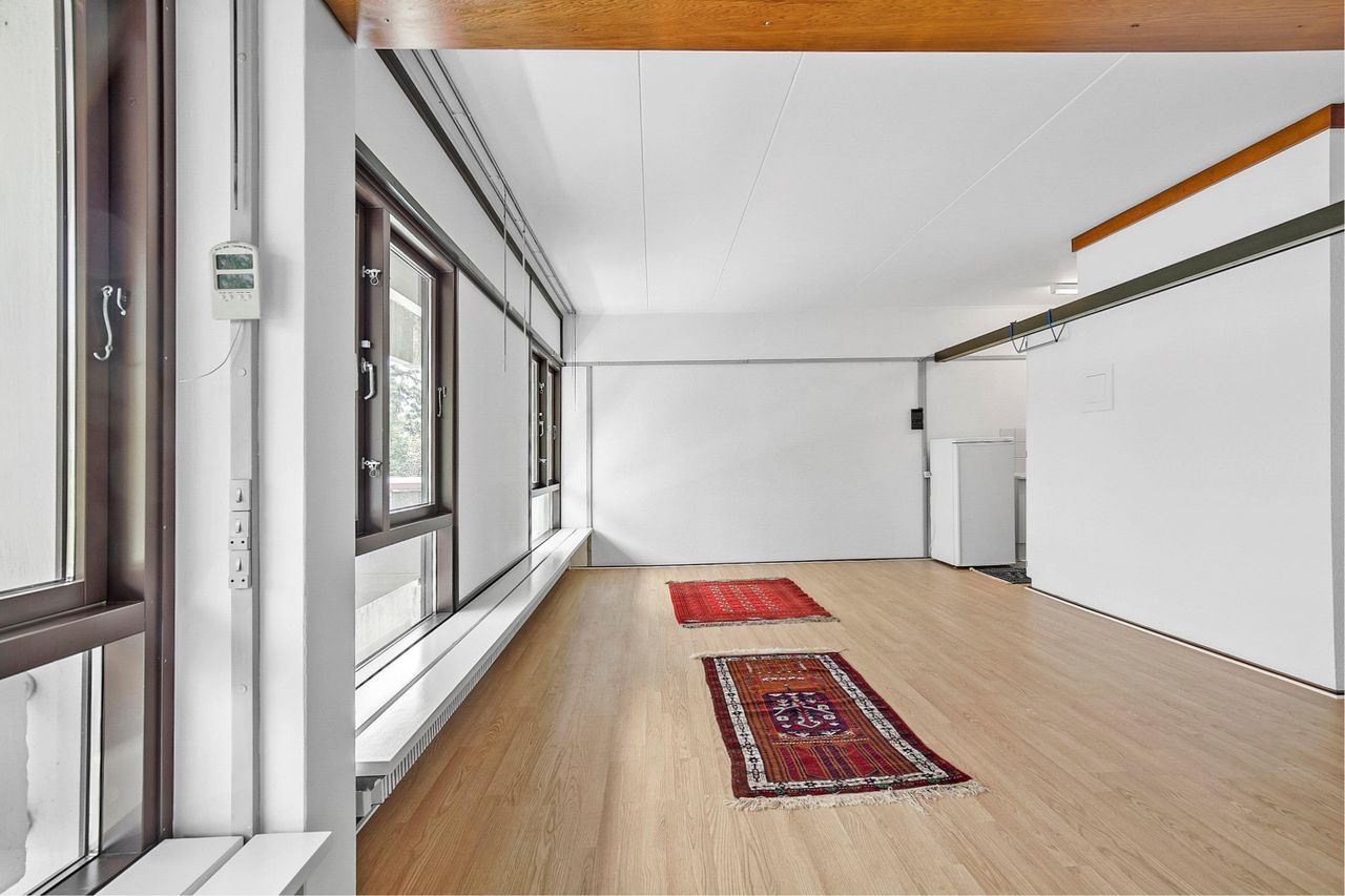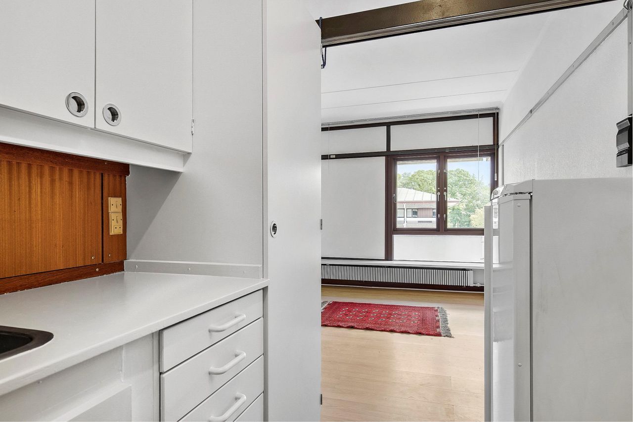 Lejligheden indeholder: et soveværelse, der er åbent ind til stuen. Et køkken der også er åbent ind stuen,